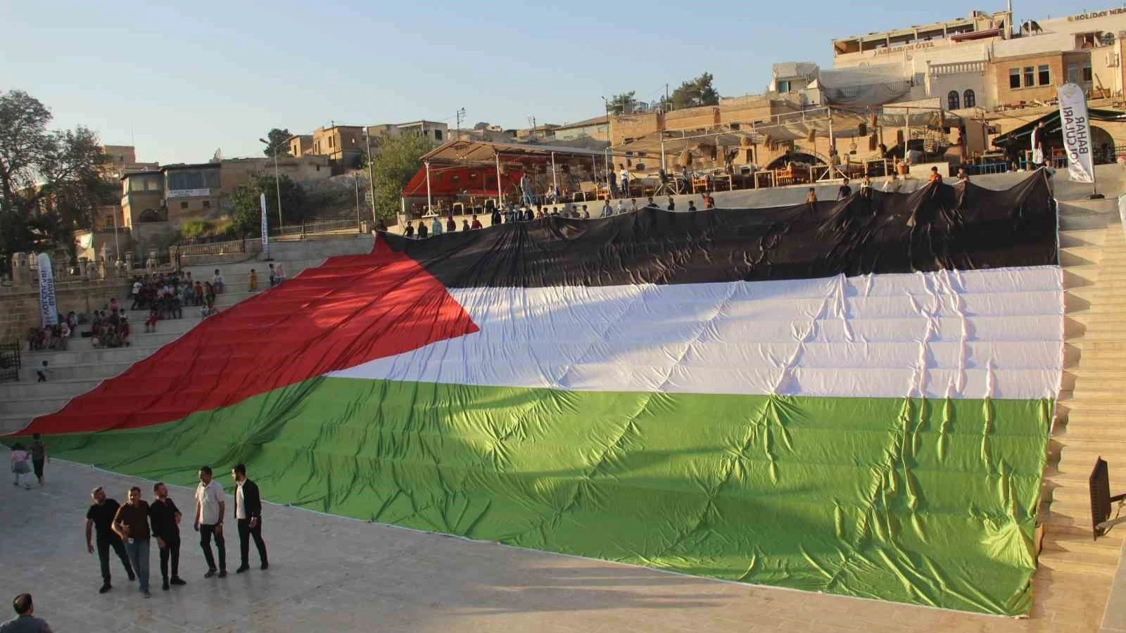 Şanlıurfa’da İsrail’in saldırıları dev Filistin bayrağıyla protesto edildi